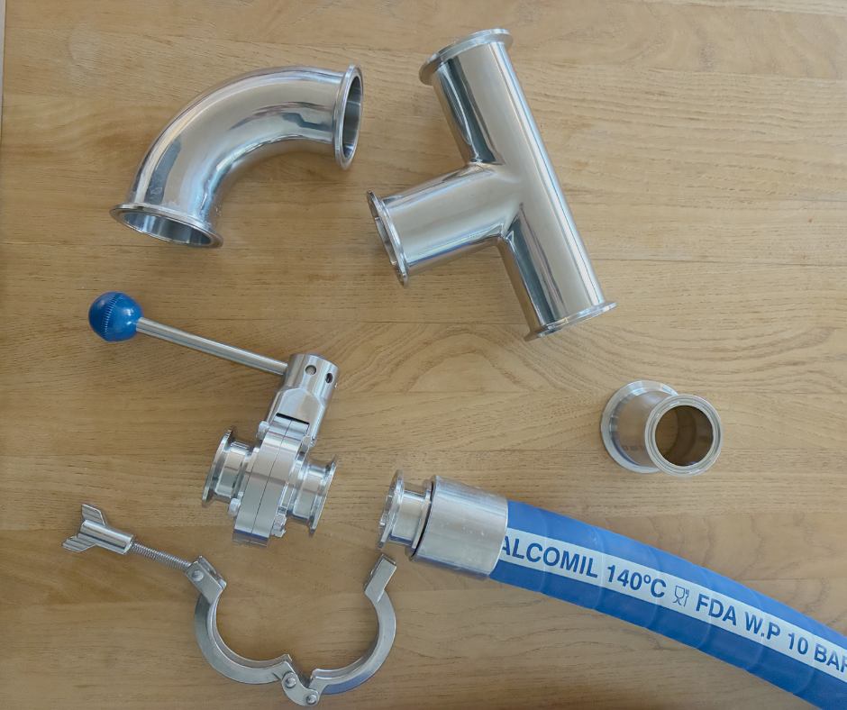 EPDM hoses and DIN 32676 Clamp stainless steel fittings (304/316).